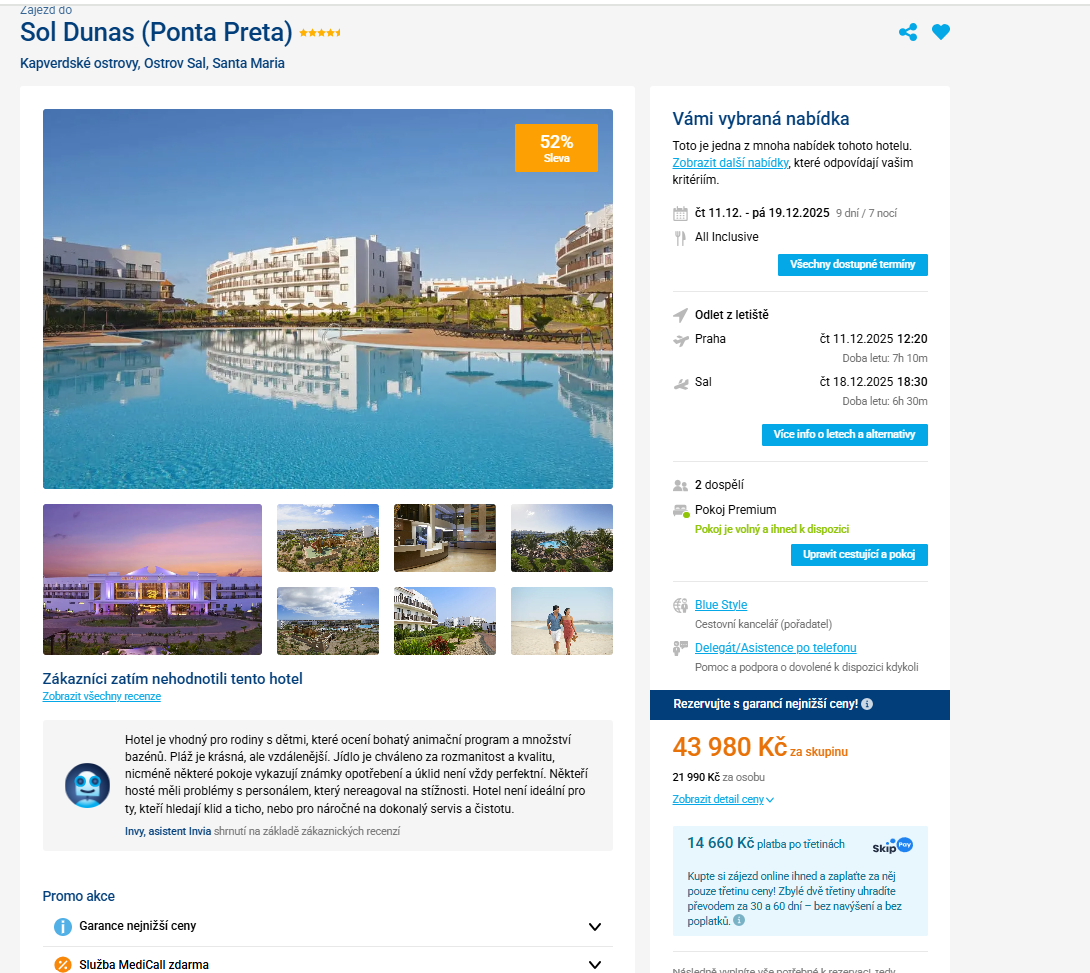 Utečte před vánočním shonem na dovolenou na Sal! Zájezd do velmi dobře hodnoceného 5-ti hvězdičkového resortu na Kapverdách na 9 dní (7 nocí) s all inclusive a odletem z Prahy pořídíte za 21 990 Kč na osobu. Zájezd je v termínu od 11. - 19.12.2025. Zájezd
