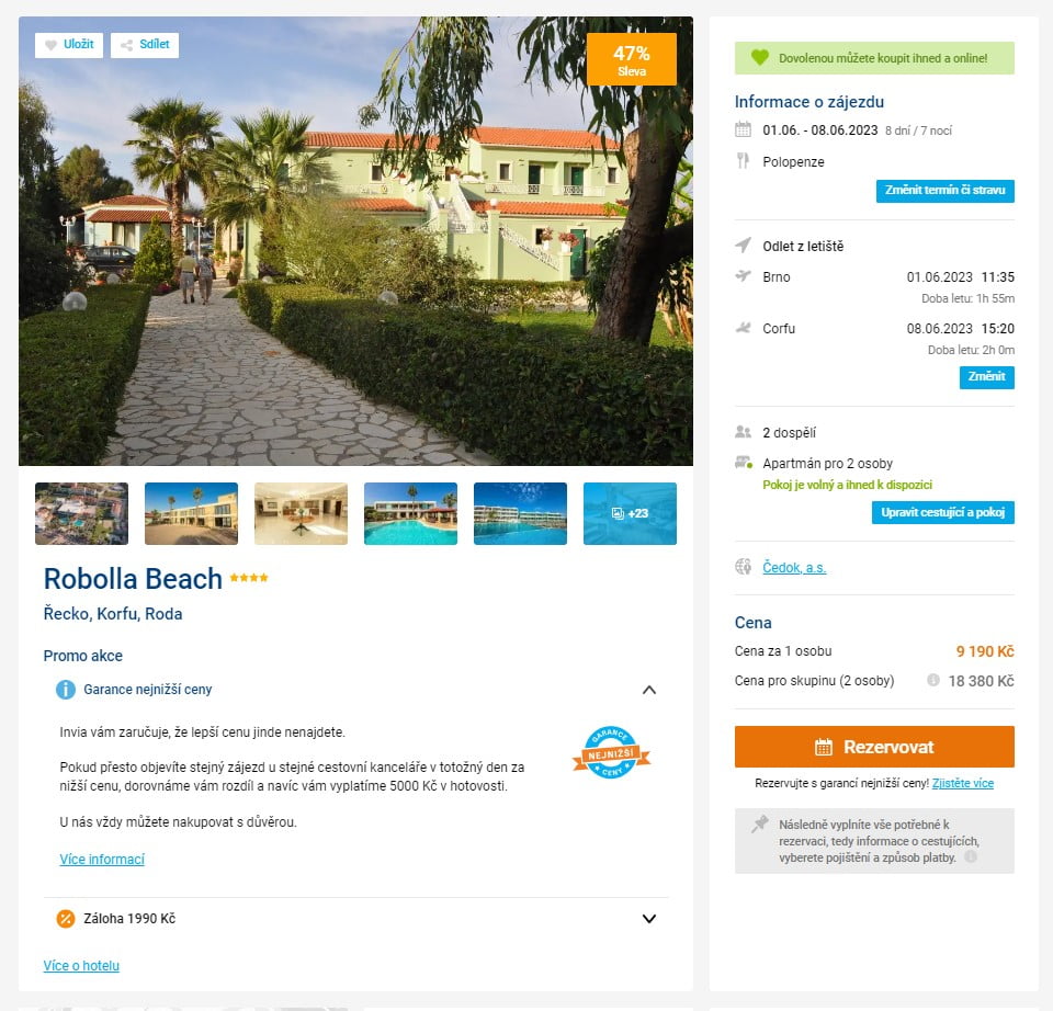 Vydejte sena začátku června na dovolenou na řecký ostrov Korfu. Zájezd do dobře hodnoceného 4-hvězdičkového hotelu s vlastní pláží a odletem z Brna pořídíte na 8 dní (7 nocí) za 9 190 Kč. Zájezd je v termínu od 1. - 8.6.2023. V ceně je polopenze. Zájezdy