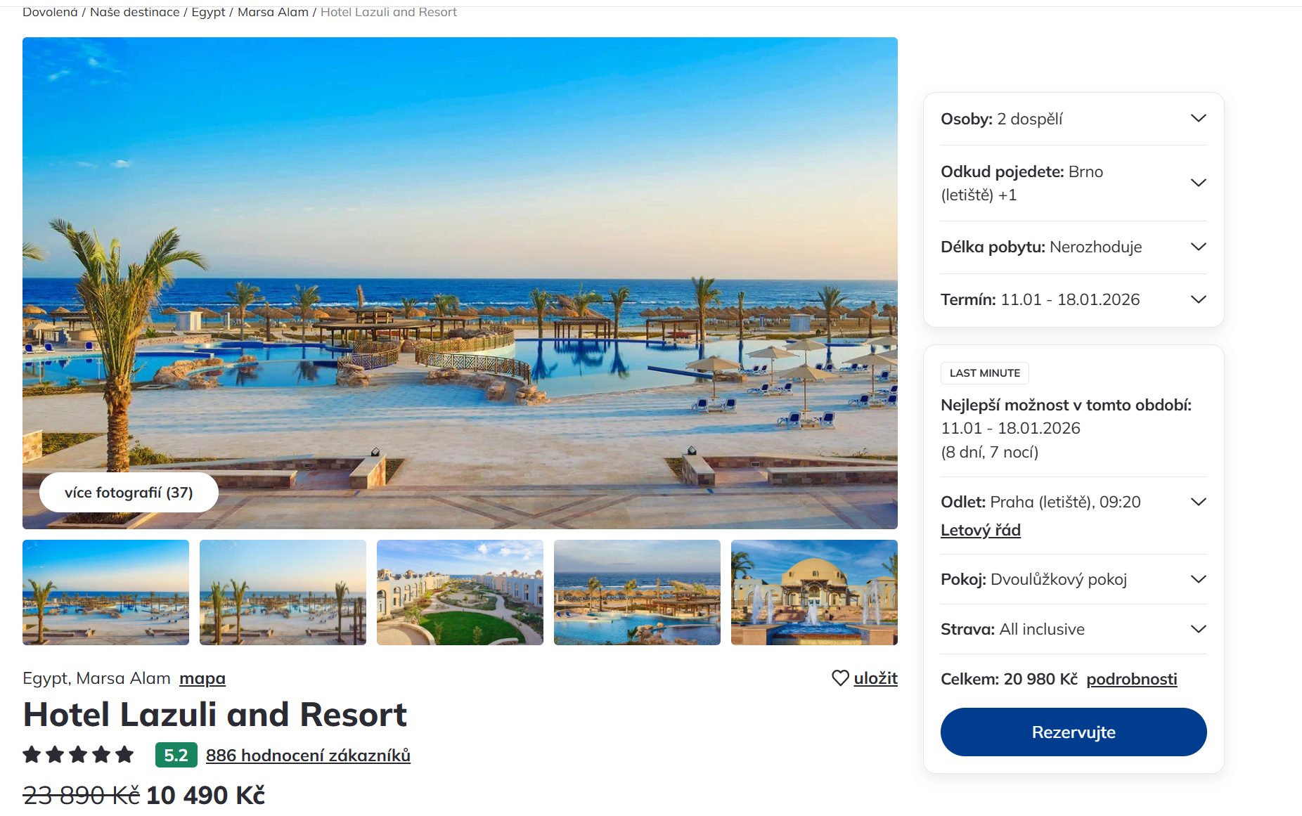 Vydejte se v lednu u z Prahy do Egypta. Velmi dobře hodnocený 4-hvězdičkový hotel je umístěn v letovisku Marsa Alam hned u pláže. Dovolená na 8 dní (7 nocí) s odletem z Prahy a s all inclusive vás vyjde na 10 490 Kč. Zájezd je v termínu od 11.  - 18.1.2025. Zájezd