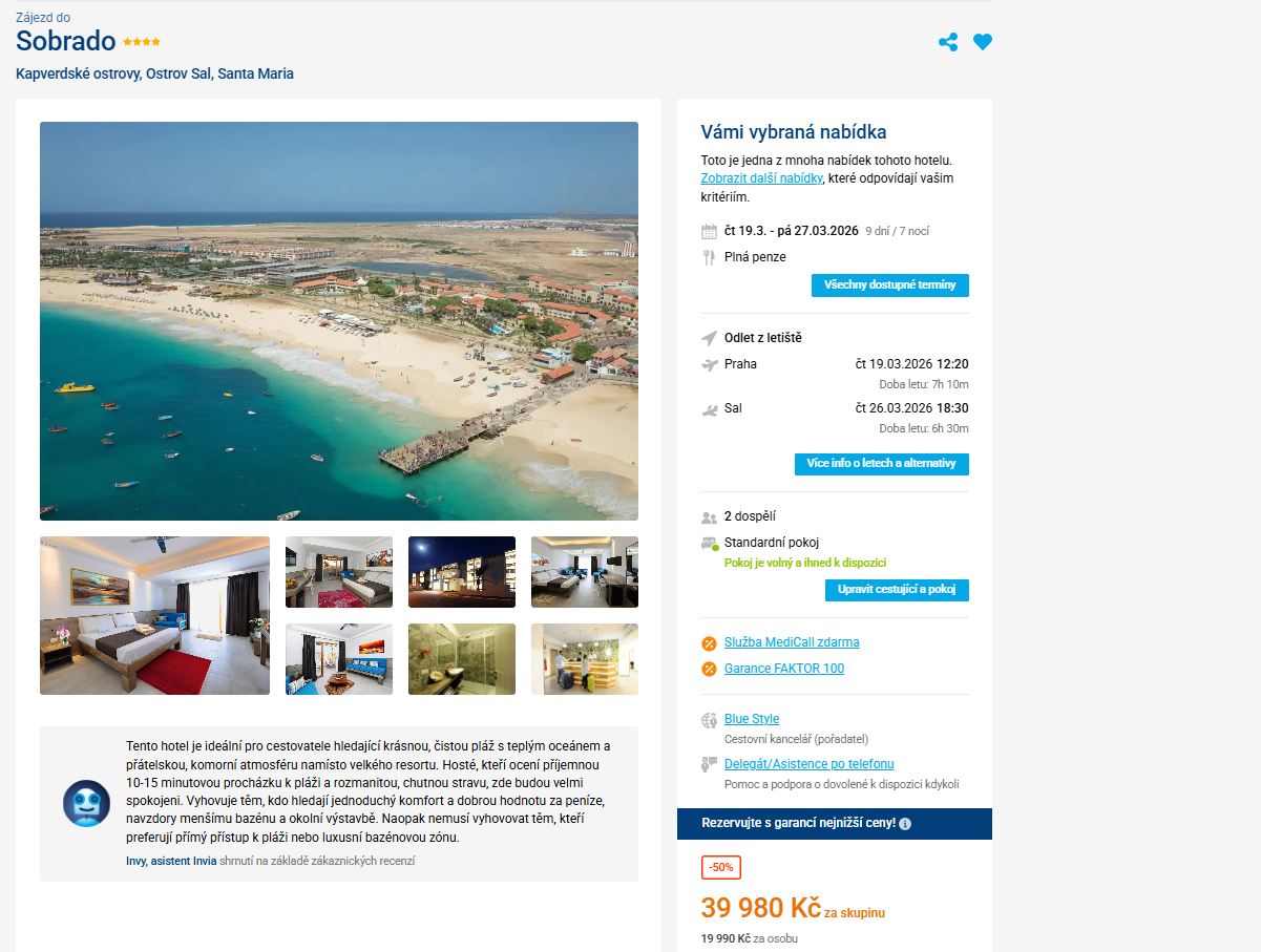 Vydejte se za týden na dovolenou na Sal! Zájezd do velmi dobře hodnoceného 4-hvězdičkového butikového resortu na Kapverdách na 9 dní (7 nocí) s plnou penzí a odletem z Prahy pořídíte za 19 990 Kč na osobu. Zájezd je v termínu od 19. - 27.3.2026. Zájezd