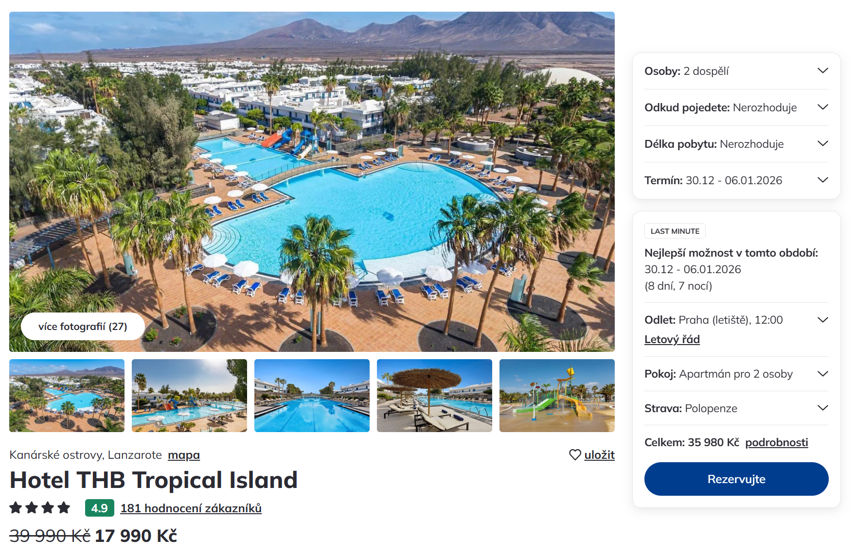 Vydejte se oslavit Silvestra na Lanzarote. Zájezd do dobře hodnoceného 4-hvězdičkového aparthotelu v Puerto del Carmen s polopenzí a odletem z Prahy vás vyjde na 17 990 Kč. Zájezd je v termínu od 30.12.2025 - 6.1. 2026. Zájezd