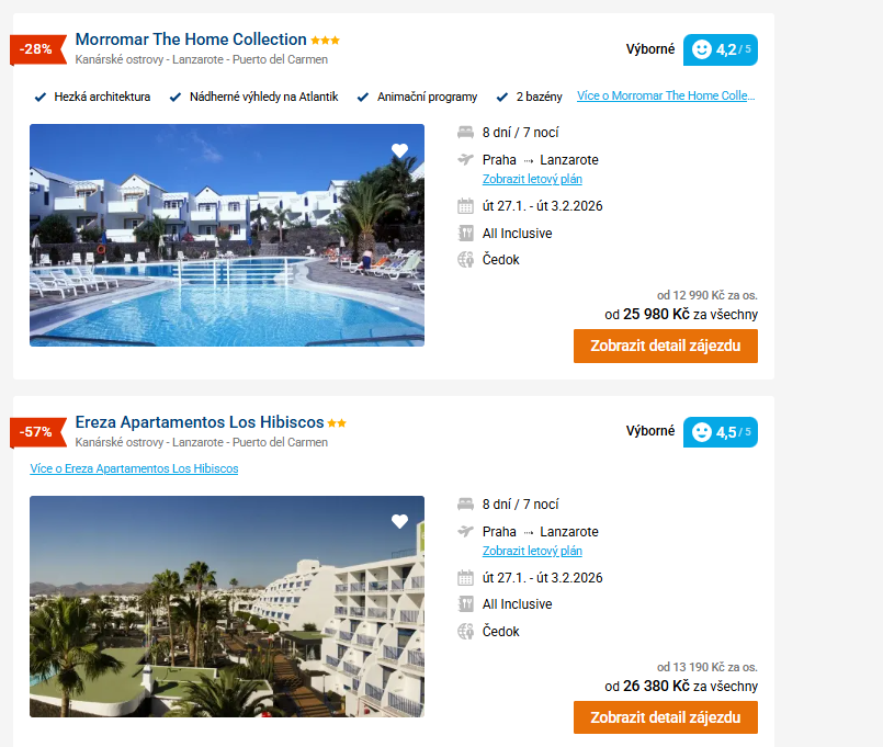 Vydejte se na konci ledna na Lanzarote. Zájezd do dobře hodnoceného 2-3 hvězdičkového aparthotelu v Puerto del Carmen a odletem z Prahy vás vyjde od 12 990 Kč s all inclusive. Zájezd je v termínu od 27.1. - 3.2. 2026. Zájezd