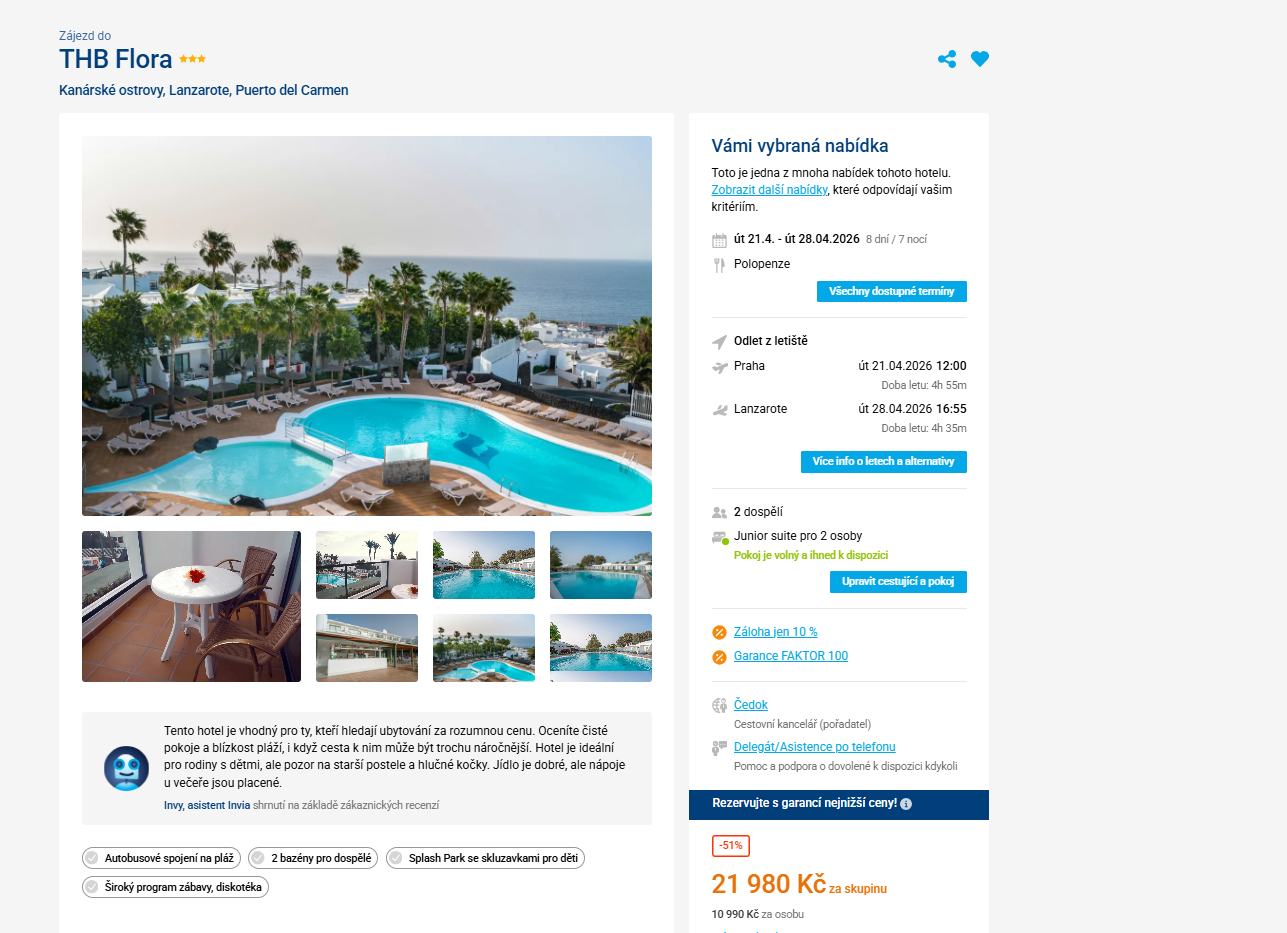 Vydejte se zítra na Lanzarote. Zájezd do dobře hodnoceného 3-hvězdičkového aparthotelu v Puerto del Carmen s polopenzí a odletem z Prahy vás vyjde na 10 990 Kč. Zájezd je v termínu od 21. do 28.4. 2026. Zájezd