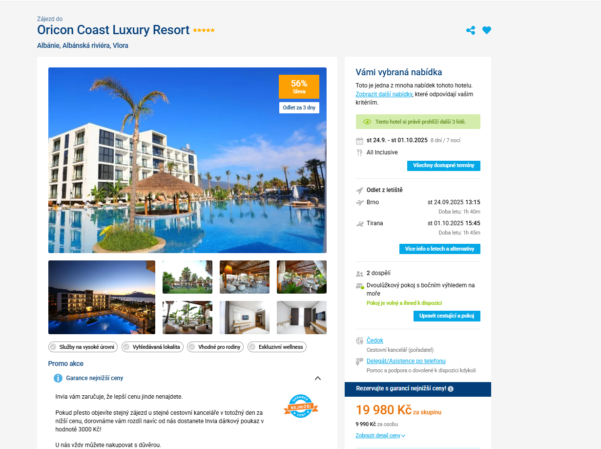 Vydejte se za 3 dny na dovolenou do Albánie. Zájezd v poměru cena/výkon do 5-ti hvězdičkového hotelu v letovisku Vlora a odletem z Brna pořídíte na 8 dní (7 nocí) za 9 990 Kč. Zájezd je v termínu od 24.9. - 1.10.2025. Zájezd