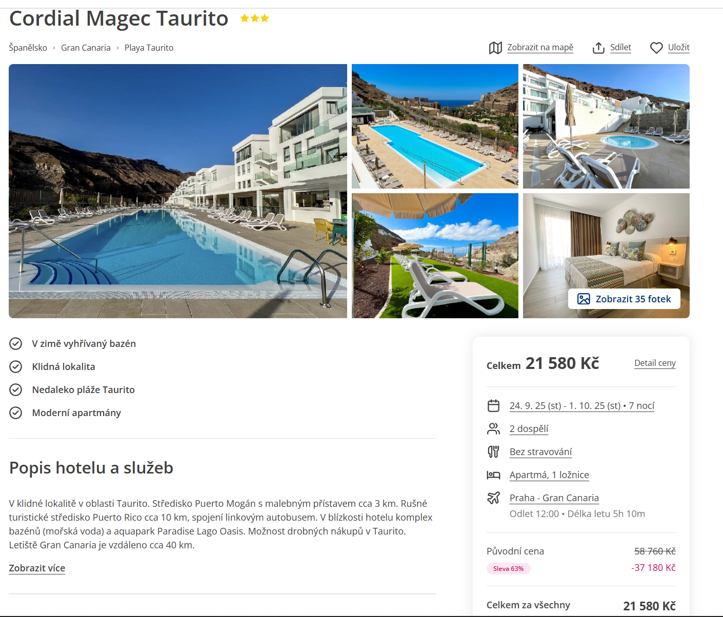 Vydejte se zítra v poledne na dovolenou na Kanáry, konkrétně na Gran Canarii. Výborně hodnocený 3-hvězdičkový aparthotel je umístěn v Playa Taurito. Zájezd na 8 dní (7 nocí) a odletem z Prahy Vás vyjde na 10 790 Kč. V ceně jsou letenky a ubytování. Zájezd je v termínu od 24.9. - 1.10. 2025. Zájezd