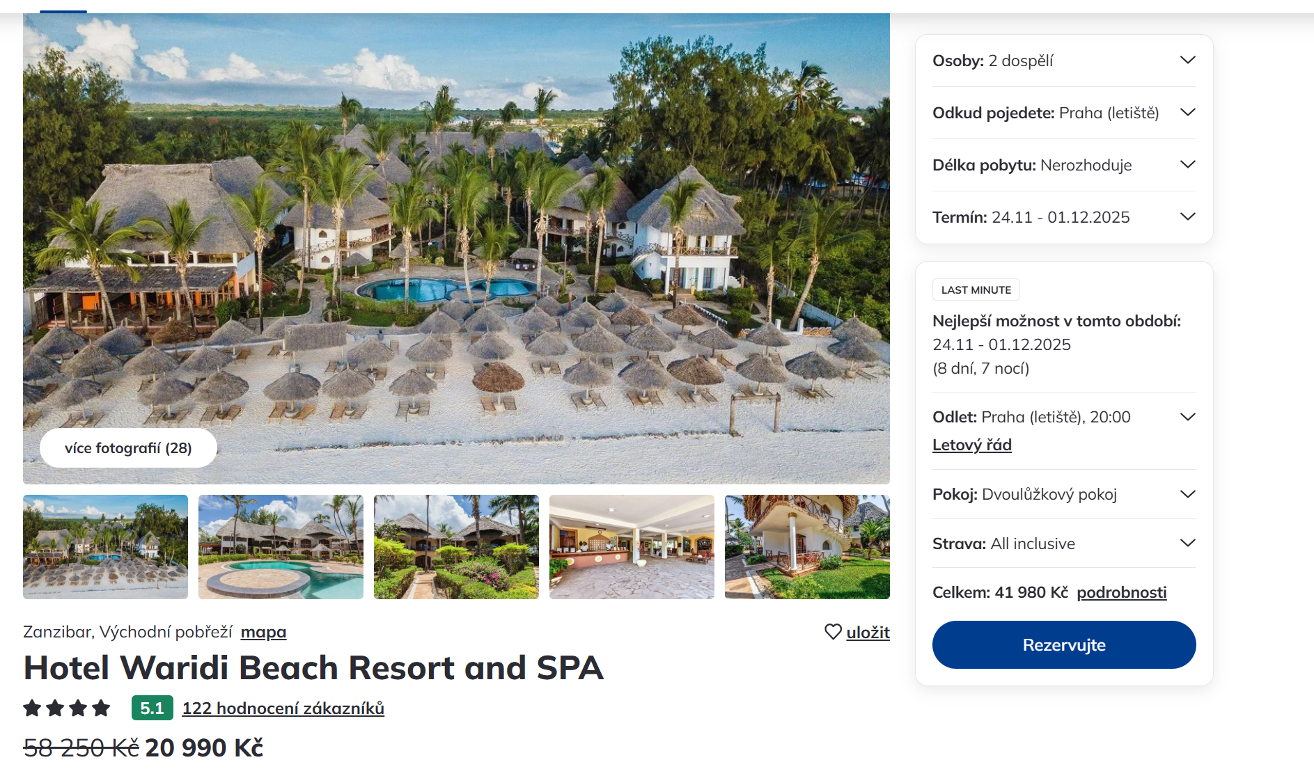 Odleťte za dva dny za super cenu na dovolenou na Zanzibar! Zájezd z Prahy do dobře hodnoceného 4-hvězdičkového hotýlku u pláže s all inclusive pořídíte za 20 990 Kč/os. Dovolená je na 8 dní (7 nocí) v termínu od 24.11-1.12. 2025. Zájezd