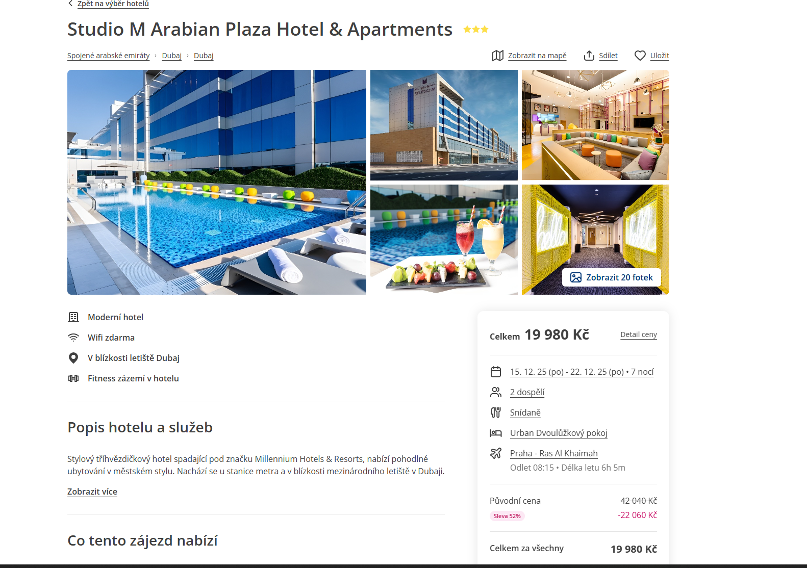 Utečte před vánočním shonem do Emirátů. Dobře hodnocený 3-hvězdičkový apart hotel s bazénem se nachází v části Deira. Zájezd na 8 dní (7 nocí) s odletem z Prahy pořídíte za 9 990 Kč. V ceně je snídaně. Zájezd je v termínu od 15. - 23.12. Zájezd