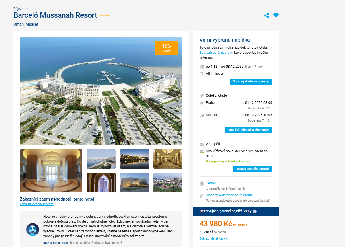 Vydejte se hned první týden v prosinci na dovolenou do Ománu. Zájezd do velmi dobře hodnoceného 4-hvězdičkového hotelu s bazénem u moře vás vyjde s all inclusive a přímým letem z Prahy na 21 990 Kč. Zájezd je v termínu od 1. nebo 8.12. 2025. Zájezd