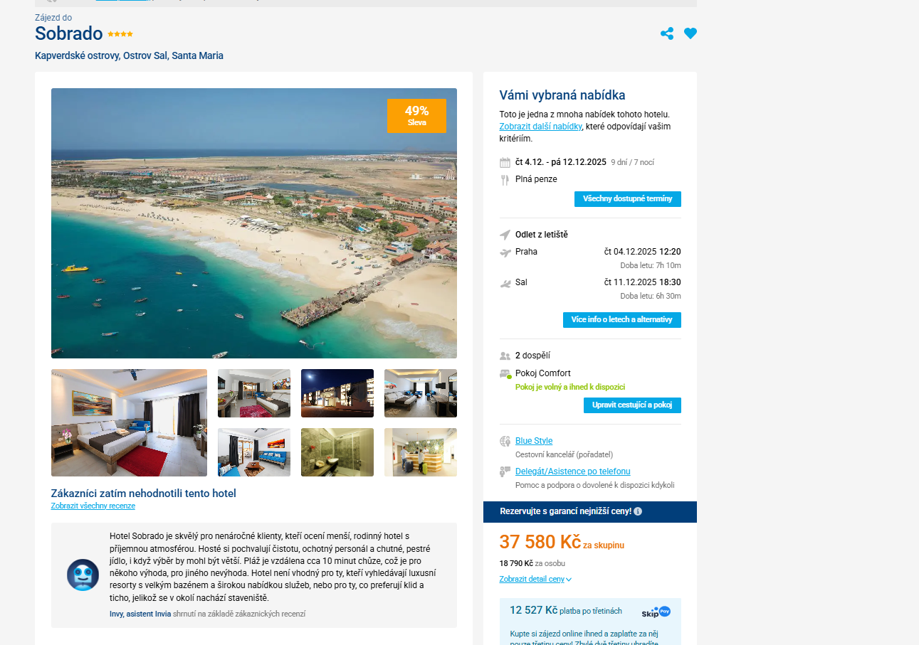 Vydejte se v prosinci na dovolenou na Sal! Zájezd do velmi dobře hodnoceného 4-hvězdičkového butikového resortu na Kapverdách na 9 dní (7 nocí) s plnou penzí a odletem z Prahy pořídíte za 11 190 Kč na osobu. Zájezd je v termínu od 4. - 12.12.2025. Zájezd