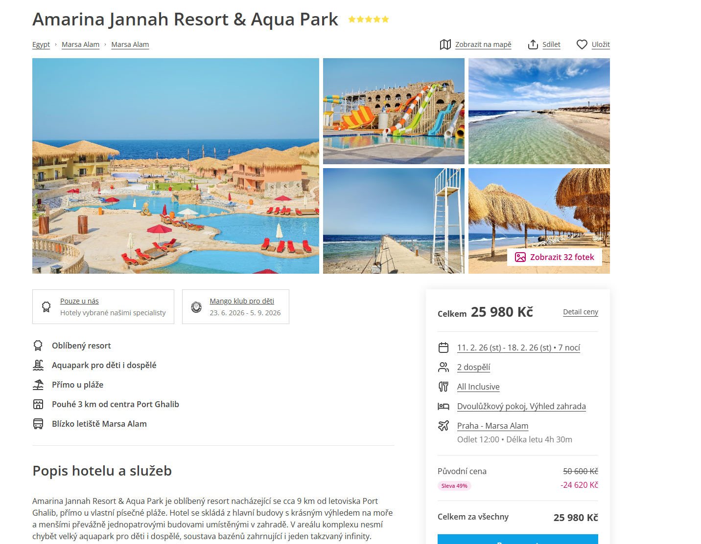 Vydejte se během zimy do Egypta. Velmi dobře hodnocený 5-hvězdičkový hotel je umístěn v letovisku Marsa Alam hned u pláže . Dovolená na 8 dní (7 nocí) s odletem z Prahy a s all inclusive vás vyjde na 12 990 Kč. Zájezd je v termínu od 11. - 18.2.2026. Zájezd