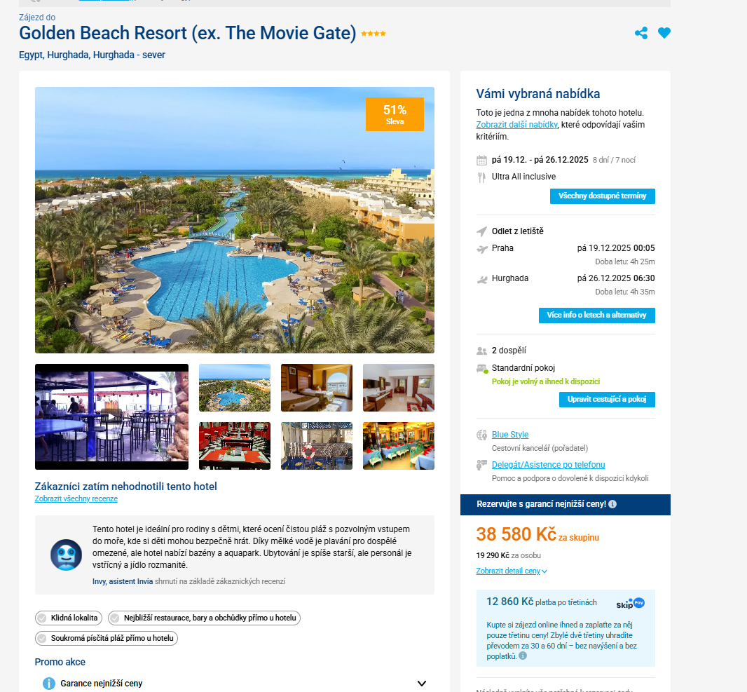 Zaleťte si přes vánoční svátky na dovolenou v Egyptě. Zájezd do velmi dobře hodnoceného 4-hvězdičkového resortu v Hurghadě pořídíte na 8 dní (7 nocí) s ultra all inclusive a odletem z Prahy od 19 290 Kč. Zájezd je v termínu od 19. - 26.12. 2025. Zájezd