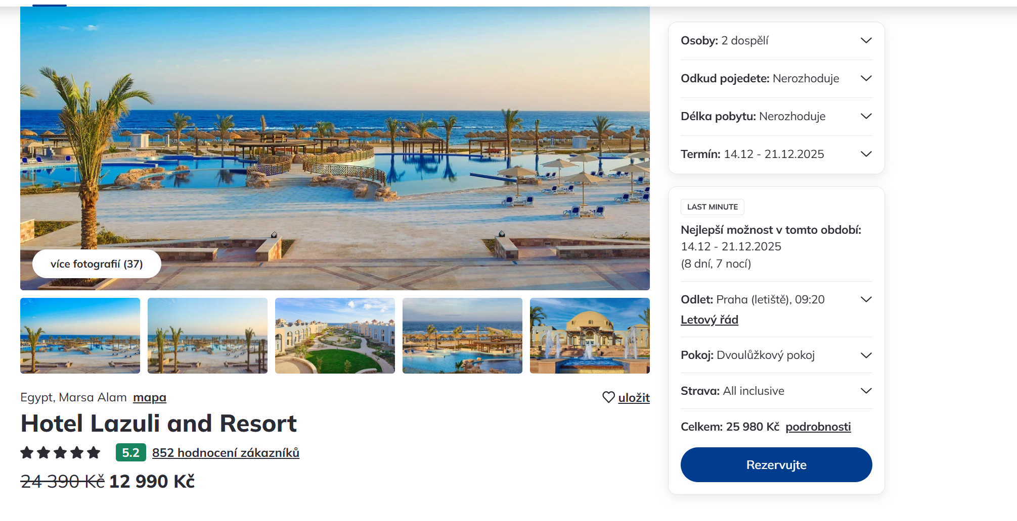 Vydejte se během adventu z Prahy do Egypta. Dobře hodnocený 4-hvězdičkový hotel je umístěn v letovisku Marsa Alam hned u pláže. Dovolená na 8 dní (7 nocí) s odletem z Prahy a s all inclusive vás vyjde na 12 990 Kč. Zájezd je v termínu od 14. - 21.12.2025. Zájezd