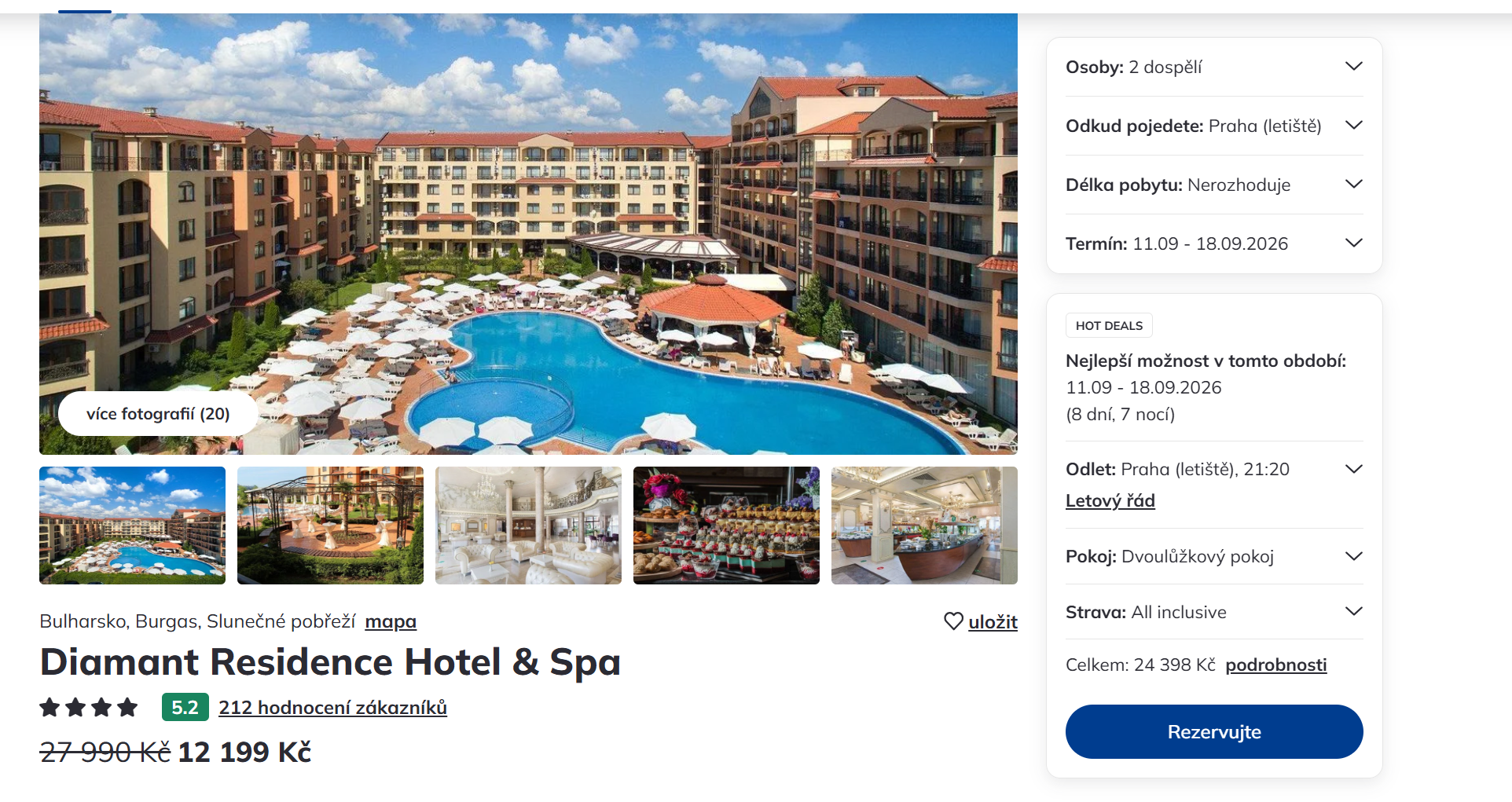 Zaleťte si v polovině září na dovolenou do Bulharska. Výborně hodnocený 4-hvězdičkový hotel je umístěn v letovisku Slunečné pobřeží. Dovolená na 8 dní (7 nocí) s odletem z Prahy vás vyjde na 12 199 Kč. V ceně je all inclusive. Zájezd je v termínu od 11. - 18. 9. 2026. Zájezd